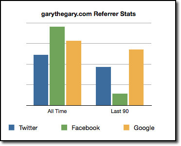 Anil’s post explains what I’ve been seeing in the traffic patterns on my blog. When I first started blogging about a year ago, most of my traffic came from Facebook. It made sense, I have a lot more facebook friends than twitter followers. But after the most recent newsfeed redesign at Facebook, their referrals have dropped precipitously.